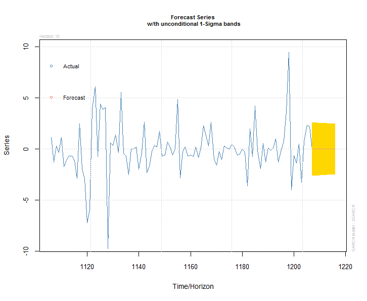 我已经用eacf识别出拟合的模型为GARCH (1,1),ARMA(0,0),所以均值方程就是ARMA(0,0),在rugarch包中用ugarchforecast做预测时,预测的均值全为0,方差在一定范围内波动,这个预测只能体现一个预测范围,那要怎么做出具体的有趋势的预测图呢?