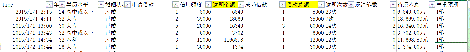 fuyangshu 发表于 2017-3-29 01:23 求问人人贷借款人的违约概率怎么算?是用逾期金额除以借款总额(即图片标黄部分)吗?还有,这个数据中的第 ...