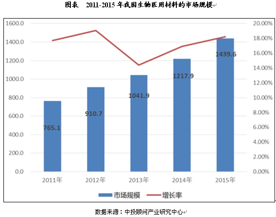 中投顾问发布的《2017-2021年中国生物医用材料行业投资分析及前景预测报告》数据显示,2015年,中国生物医用材料市场规模约为1439.6亿元,同比增长18%。保守估计10年内我国将成长为世界第二大生物医用材料市场。