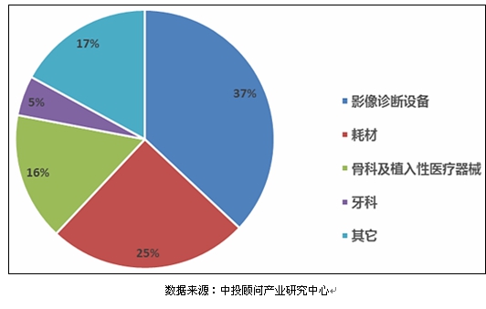 目前我国医疗器械市场上,影像诊断设备占据37%的市场份额,其次是各类耗材占25%,牙科器械材料近几年呈不断上升趋势,市场前景看好。