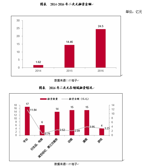 中投顾问发布《2017-2021年中国动画产业投资分析及前景预测报告》中指出2016年共完成二次元领域投资共计24.5亿元77笔,数量与2016年相当但金额大幅提高,这一方面表明动漫二次元产业热度未减,另一方面说明投资已经逐步由早期天使轮向中期转变,产业日趋成熟。细分领域中,2016年动画类公司融资共计15笔,融资规模2.09亿元,相比平台和漫画,动画类融资增速显著放缓。