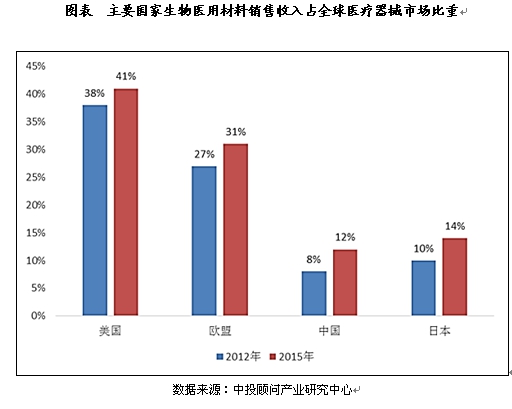 近20年来,全球生物医用材料和制品持续增长,美国、西欧、日本仍然占据绝对领先优势。中投顾问发布的《2017-2021年中国生物医用材料行业投资分析及前景预测报告》数据显示:2015年,美国、欧盟、中国、日本销售收入占全球医疗器械市场之比分别为39%、28%、12%和11%。