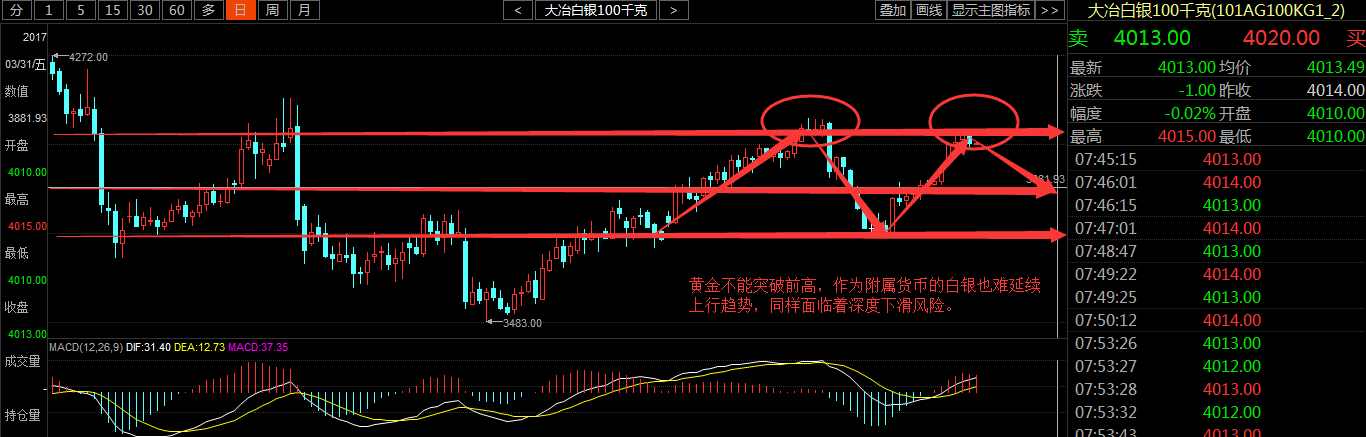 鉴于白银走势的钝化特性,行情发展可能会缓慢一些,但是上方承压无法突破的情况下,预期走势终会走出,以时间去换取空间