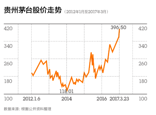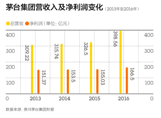 2016年12月,贵州茅台发布2016年的主要经营数据,称全年营收达到398.6亿元,同比增19.16%,而归属于公司股东的净利润为166.5亿元,同比增长7.4%。同月,在茅台内部每年最为重要的年度营销工作会议上,公司高层提出“到2020年年末要实现千亿元营收”的目标。