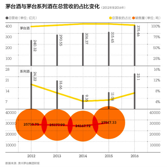 2014年系列酒营收只占贵州茅台总营收的2.96%,此后经过两年努力,到了2016年,其比例已经上升至6%,营收达到23亿元。贵州茅台预计,今年系列酒的全年营收有望突破43亿元。