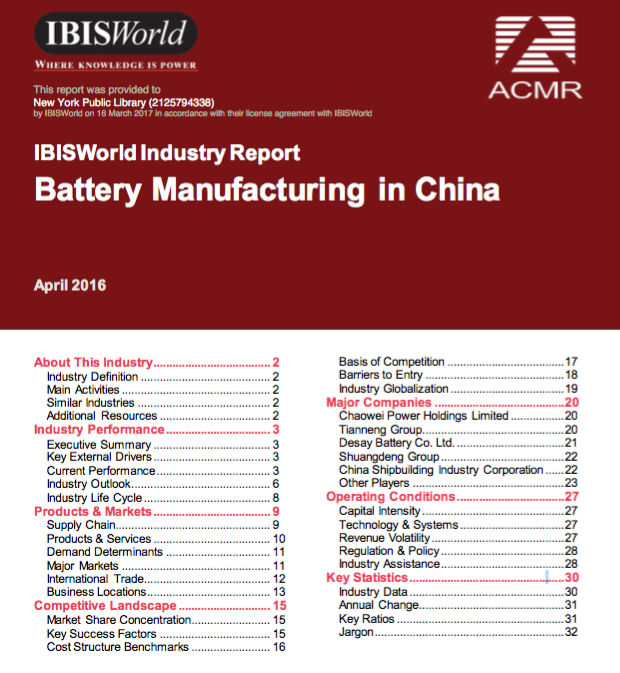 IBISWorld Battery in China 中国电池制造业英文行业报告