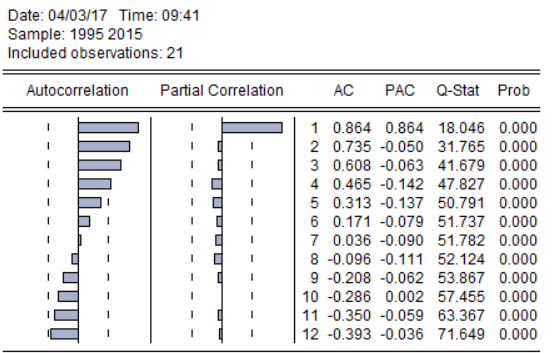 问题:1、怎么做相关性检验?D-W还是LM法?LM出来怎么都是NA,直接LS回归,DW值是1.08,网上查了一下表(n=3)好像还满足,但D-W是不是必须一阶?