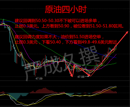 技术面看来,小时图可以看出,均线排列向上,MACD有粘合迹象,绿色动能减弱,KDJ向上发散;在四小时线看来,目前布林带又开口向上迹象,K线处于布林带上轨和中轨之间偏下运行,附图上MACD指标处于0轴上方,红色动能减少;日线图上看MA5和MA10金叉向上运行,布林带张口向下运行,K先处于布林带中轨运行,附图MACD指标处于0轴上方,红色动能减量;日线图看已经连续三日收阳,5日均线上穿10日均线金叉运行,短期来看,目前原油上方已经无压力,可直接上看51.50一线,所以下周我们继续关注原油的上涨力度做单方面我们关注下方49.5一线的支撑,综合看来,严成久认为原油操作高空低多的思路,上方阻力位在51-51.5,下方支撑位在49.5,然后在49,跌破48将再次看空。严成久建议回调低位做多为主。上方关注51;下方关注49.5。
