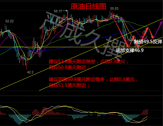 2、建议回落50.8美元附近做多,止损0.3美元,目标51.5美元附近;