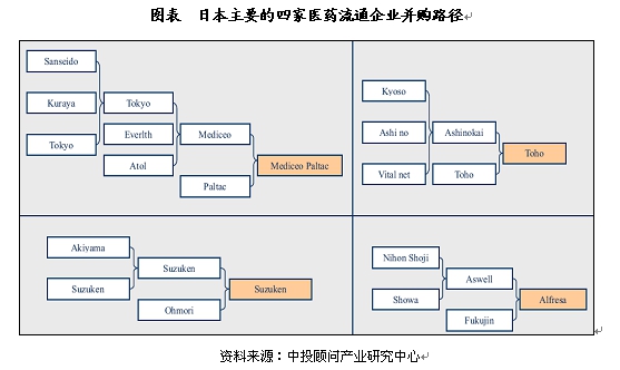 中投顾问在《2017-2021年中国医药流通行业投资分析及前景预测报告》中表示,日本医药分销企业也是通过并购推动了整个市场集中度的提升。目前日本最大的四家医药分销企业分别是Medico、Suzuken、Alfresa和Toho,它们占到了全日本80%左右的市场份额。这四个企业也是通过不断的并购迅速扩大了自己的销售规模。