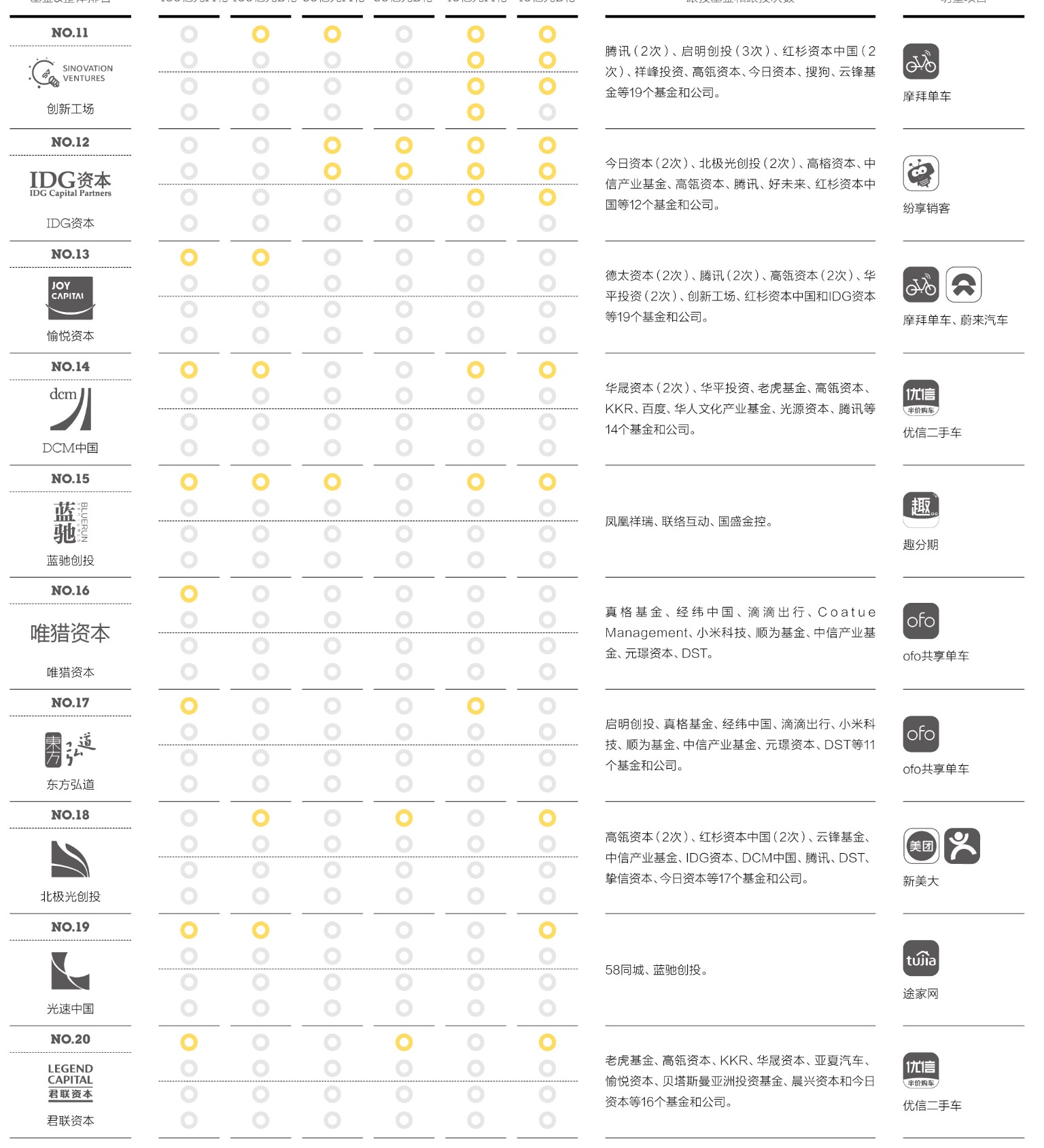 Unicorn Rank最后一个重要的维度是所投公司的影响力。摩拜单车和ofo共享单车这样的项目在极短的时间内影响到了公司人,并且给公司人的生活带来了巨大的改变。作为摩拜单车A轮的唯一投资方,愉悦资本这个成立不到两年的新基金也进入了今年的榜单。