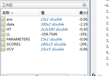 6.然后得到输出的各个结果,在命令下窗口输入【 [PARAMETERS,LL,HT,VCV,SCORES] = bekk(data,[],1,1,1,'Full')】回车,得到了各个参数和矩阵,系数等等,可在工作区中查看