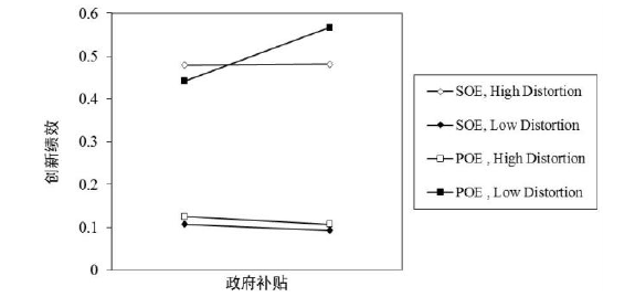 回归结果显示:政府补贴对企业创新绩效存在显著的正向激励;所有制和政府补贴以及要素市场扭曲程度和政府补贴的交互项是显著为负的,这就意味着所有制和要素市场扭曲程度对政府补贴和企业创新绩效关系都存在着显著的负向调节。因此假设1和假设2得到支持。