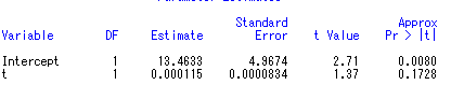 model x=t/nlag=1 garch=(p=1,q=1);
