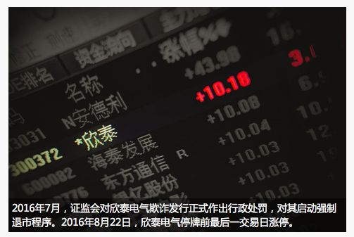 2016年7月,证监会对欣泰电气欺诈发行正式作出行政处罚,对其启动强制退市程序。