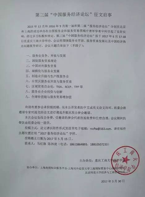 投稿方式:论文请以word附件形式发送至电子邮箱:rccfta@163.com,请在邮件主题位置注明“2017服务经济论坛”字样。