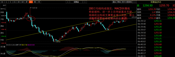 国际黄金时局动态:在上周五,国际黄金一度飙升近20美元,因特朗普下令轰炸叙利亚政府军目标,市场避险情绪激发,对于黄金这一避险资产而言,战争消息面都是最好的上涨催化剂,而之后,美国就业数据的不佳令黄金价格进一步走高触及1270一线高位。然而在这双项利涨的基本面支撑下,黄金价格在当晚却回吐涨幅急速下跌至当日起涨位附近,意外过山车行情让大多数投资者措手不及。
