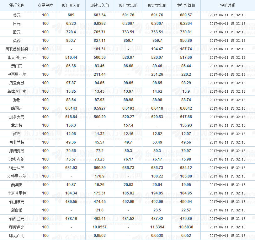 中国银行外汇牌价 2017-04-11(图片来源:东方财富网)
