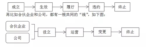 经济法的考点很多,知识点非常琐碎,我们要把这些零散的知识点用一条主线串连到一起。在复习过程中,有意识地找到这些“线”,记忆将更有条理、更有序。比如合同法有一根明显的“线”,如下图: