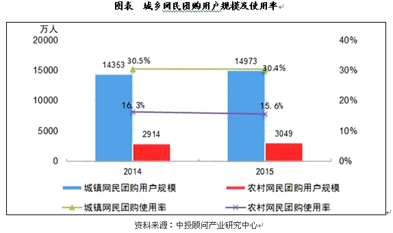 截至2015年12月,农村网民团购用户规模为3049万,用户规模较上一年提高了4.6个百分点。城镇网民团购用户规模达到1.50亿,年增长率为4.3%。农村网民团购使用率为15.6%,相较上一年下降0.7个百分点,比城镇网民使用率低14.8个百分点