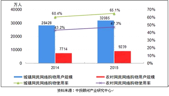 中投顾问发布的《2017-2021年中国农村电商市场深度调研及投资前景预测报告》数据显示,截至2015年12月,农村网民网络购物用户规模为9239万,相比上一年增加了1525万,年增长率达19.8%,农村地区网络购物市场依然保持着稳健的增长速度。同时,城镇网民网络购物用户规模为3.21亿,增幅12.9%,低于农村网民。农村网民网络购物使用率为47.3%,使用率较上一年增加了4.1个百分点,比城镇网民网络购物使用率低17.8个百分点。