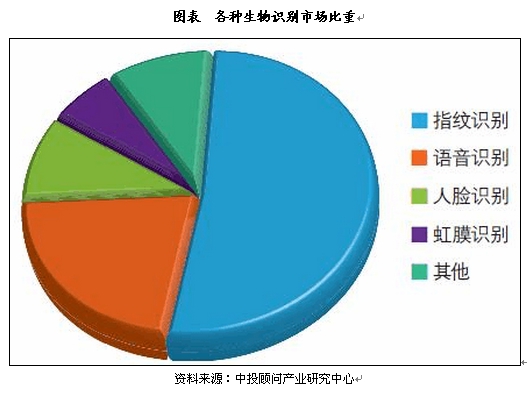 生物识别技术中应用最广泛的是指纹识别。最近几年,指纹传感器成本的下降使得这项技术在智能手机和平板电脑上的应用大大增加。专家预计,虹膜识别技术这一领域市场规模将会以每年28.6%的速度增长,主要原因是虹膜具有非常高的识别精度。将会积极增长的领域还有多模式生物识别技术,这是一项结合人体多个生物特征进行混合识别的技术。
