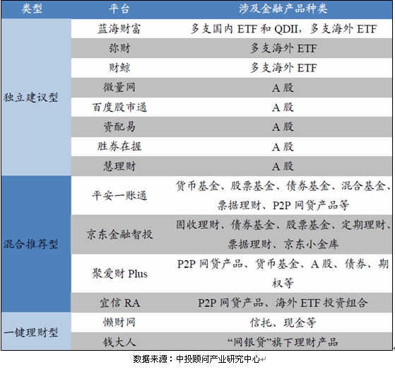 欧美蓬勃发展趋势下,我国智能投顾亦快速兴起。据不完全统计,我国目前宣称具有智能投顾功能或者正在研发智能投顾的互联网理财平台超过20家,中投顾问《2017-2021年智能投顾产业深度调研及投资前景预测报告》按业务模式将这些平台分为三类:1、独立建议性:提供诸如A股仓位、买卖点等建议或资产配置建议;2、混合推荐性:推荐与客户风险相适应的基金或其他理财产品;3、一键理财型:帮助客户管理资金并投资,通过第三方平台存放资金保证客户资金的安全。