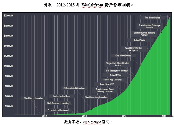Wealthfront的前身是成立于2008年的一家财富管理公司Kaching,2011年12月更名为Wealthfront,目前是美国机器人投顾行业的一大巨头。Wealthfront的管理资产规模自2013年开始爆发式增长,至2014年年中管理资产规模突破了10亿美元,截至2015年9月,管理资产规模已经达到了26亿美元。