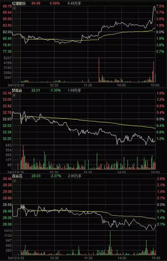 娱乐圈如此热闹,作为投资市场最不缺娱乐精神大A股自然也不甘寂寞。早盘萎靡不振的“出轨概念股”红墙股份(SZ:002809)在午后放量走高,至收盘大涨6.09%。而与白百何名字相仿的个股梦百合(SH:603313)、百合花(SH:603823)则纷纷走低翻绿,截至收盘,分别跌1.35%和2.27%。