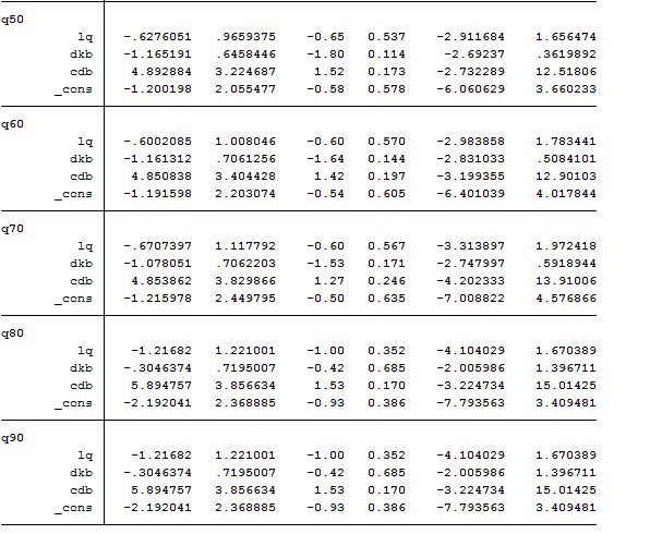 爱上一匹野马 发表于 2017-5-16 16:39 我对这个这个分位数回归也不是很了解,只是照葫芦画瓢借鉴别人的方法,我的理解是分位数回归是考察在各个 ...
