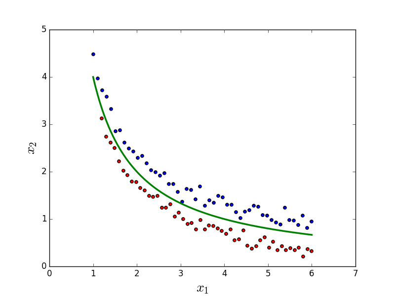 有时机器学习中需要生成不同形状的训练数据来测试算法性能,下面的代码可以生成一个决策边界为双曲线的训练数据,并用 Matplotlib 画图展示出来:
