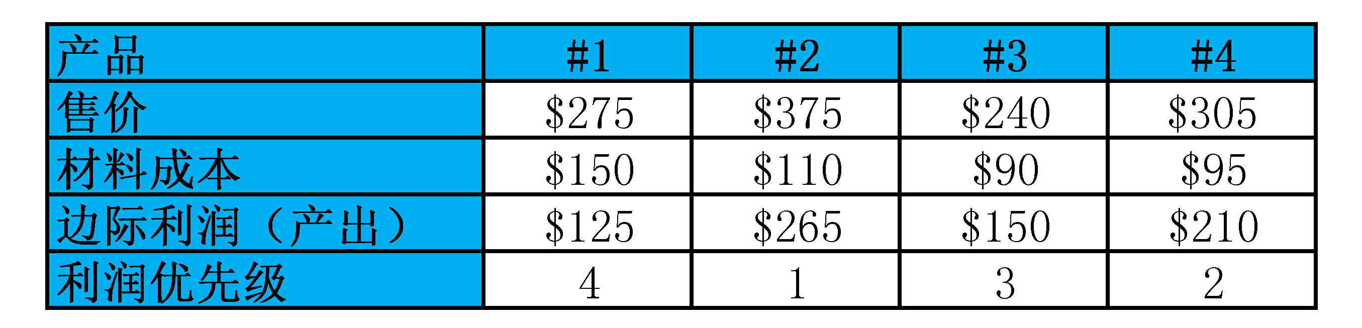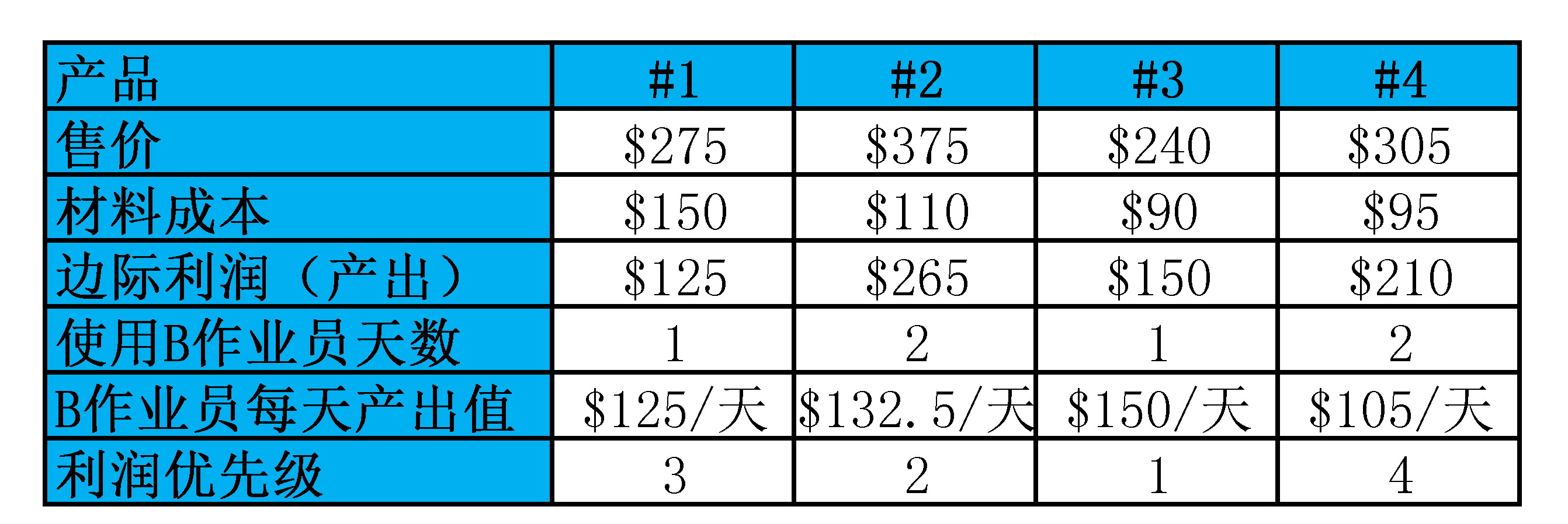 从传统的角度看,产品#2最赚钱生产9个(用掉18天B作业员的时间),产品#1跟#3是较不赚钱,各生产4个满足需求就好(各用掉4天B作业员的时间),还剩10天B机器时间生产5个产品#4。