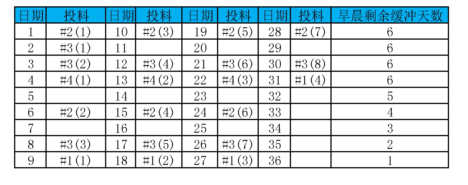 因为每天到结束时才消耗1天的时间缓冲,如果投料选择在一天的开始的话,那么第一次的时间缓冲应该不包含产出消耗量,以后每天需要包含。所以偏差缓冲为2天,以后每一天的投料只要与产出消耗缓冲量相等就能保证偏差缓冲量为0。如果投料的是#2或#4(各包含2天的B缓冲),那么应该隔一天再投料。