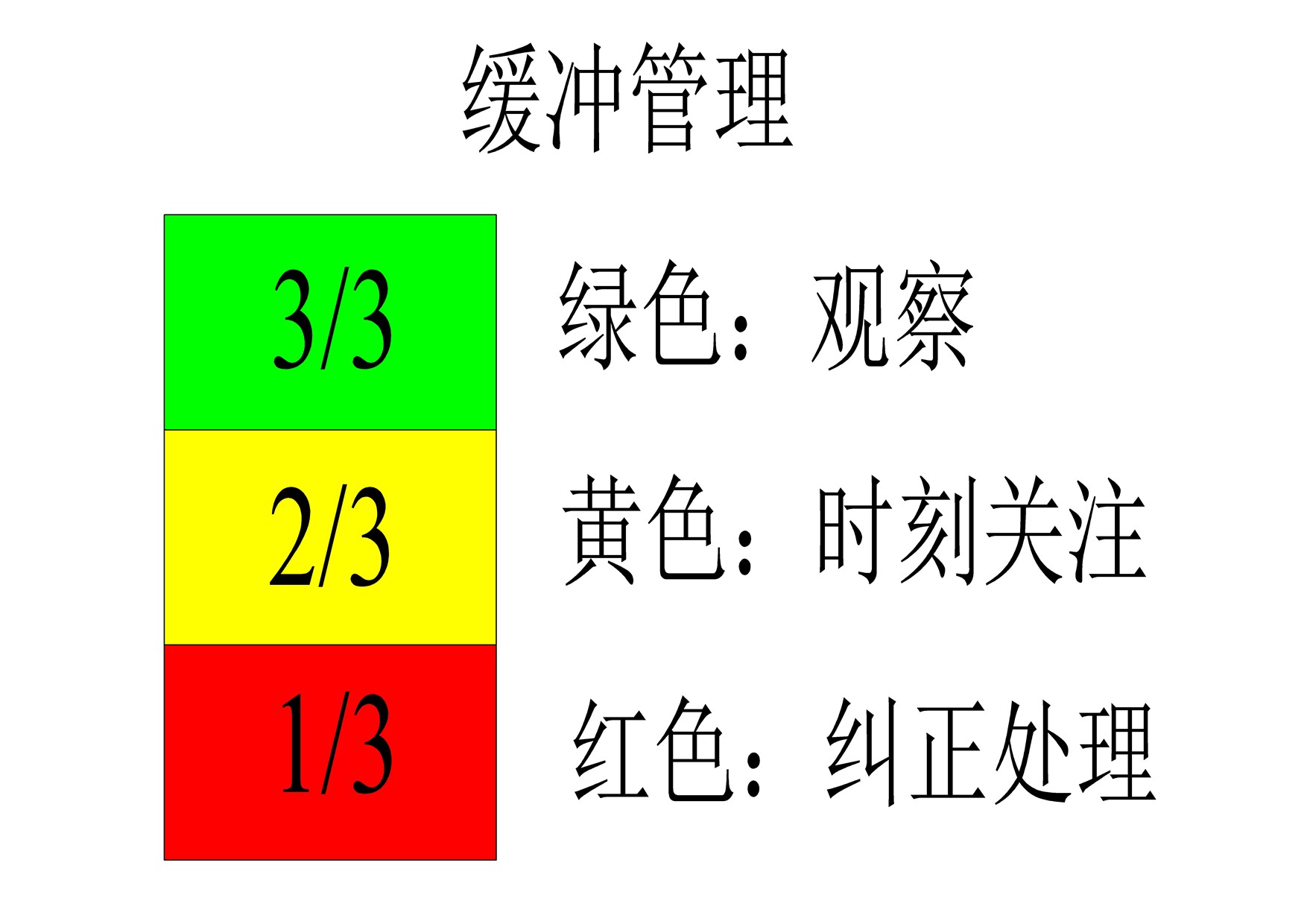 缓冲管理将缓冲分成3种状态,它将缓冲平均分成3份,剩余2/3倍以上缓冲为绿色,不需要处理,这需要观察就行;剩余1/3-2/3倍的缓冲需要时刻关注;剩余小于1/3倍的缓冲,要立刻采取纠正行动,防止剩余缓冲用完而影响瓶颈的产出。