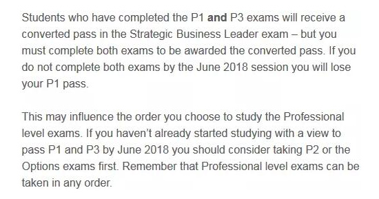 3、建议学生或在2018年9月之前通过P1、P3考试,或者在2018年9月之后直接参加Strategic Business Leader的考试。