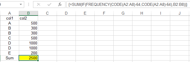 phipe 发表于 2017-4-17 19:14 试试这个: =SUM(IF(FREQUENCY(CODE(A2:A8)-64,CODE(A2:A8)-64),B2:B8))
