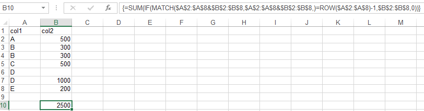 phipe 发表于 2017-4-18 18:48 是不是这样: {=SUM(IF(MATCH($A$2:$A$8&$B$2:$B$8,$A$2:$A$8&$B$2:$B$8,)=ROW($A$2:$A$8)-1,$B$2:$B$8,0))}