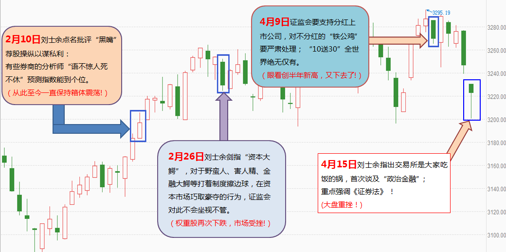 从上图可见,今年以来刘士余4次讲话中3次都痛击市场,前三次可以看做“黑嘴”治理证券市场。但这周末的不同,刘主席释放了重大信号,对未来市场走势极为重要,最关键的是大家可理解为刘主席有意透露股市投资机会。