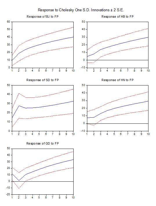 这几个图全都是向上倾斜,并不回复到0,可能需要检验一下VAR是否平稳,做一下协整检验。