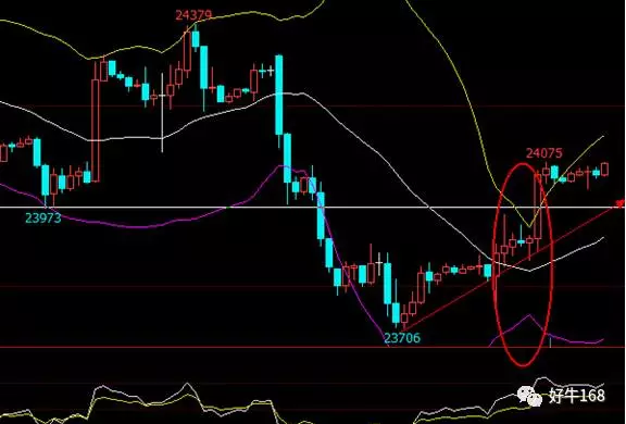 1小时k线看,boll开拉升大喇叭,重心不断上移,走出一波反弹行情。前期支撑位23973或将成为恒指短期的支撑。建议24000附近做低吸,止盈于24150附近,止损于23973附近,若快速上攻24300,不建议在24300附近再次追涨。同时恒指出现这波蓄势反弹,即便快速反弹至24300附近仍不能能沽空,而是先保持观望。若24420附近疲软才可考虑是否做空,建议低吸为主。