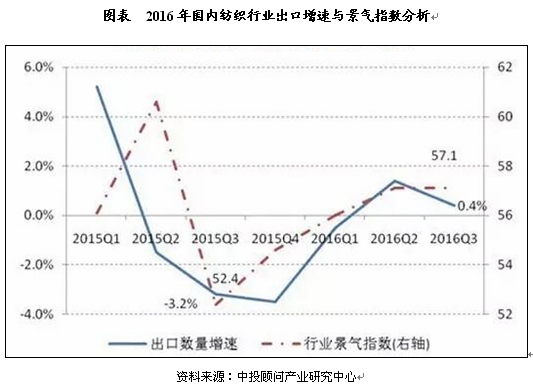中投顾问《2017-2021年中国纺织业投资分析及前景预测报告》中数据指出,2016年,行业第三季度景气指数为57.1,与二季度基本持平,高于2015年同期指数4.7个百分点,2016年以来呈现逐渐回升态势,为行业平稳运行提供支撑。其中,新订单指数、成品销售价格指数、原材料购进价格指数和从业人员指数较2016年二季度不同程度提高,预示着织品服装产品市场供求关系出现积极变化,为下一步行业投资和消费注入信心。