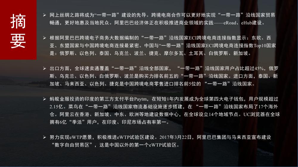 2017年4月21日,阿里研究院与DT财经联合发布《eWTP助力“一带一路”建设——阿里巴巴经济体的实践》报告,这是第一次以大数据的形式,描绘出跨境电商连接起来的网上丝绸之路。