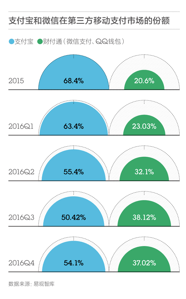 小程序承载着连接线下到线上的作用,而线下场景是微信和支付宝许久以来较量的关键,与二者已经广泛铺开的线下支付场景结合,小程序可能会有更多的想象空间。考虑到支付宝在线下支付市场占据了更大的市场份额,以及导流的作用,其小程序虽然晚了半年,也未必不会后来居上。