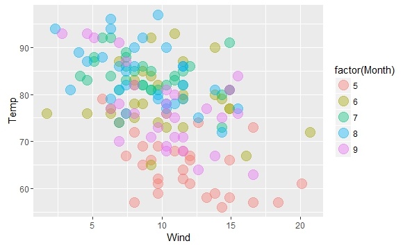 + geom_point(aes(color=factor(Month)),alpha=0.4,size=5) #按照月份进行绘图,factor需要在外面用aes()函数进行处理
