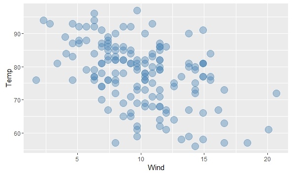 + geom_point(color="steelblue",alpha=0.4,size=5) #添加图片的基础信息