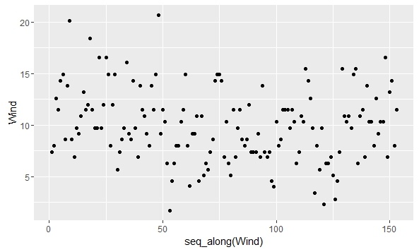 > qplot(y=Wind,data=airquality) #当输入y=**时,生成的是散点图
