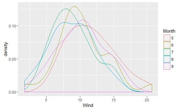 > qplot(Wind,data=airquality,geom="density",color=Month) #密度函数