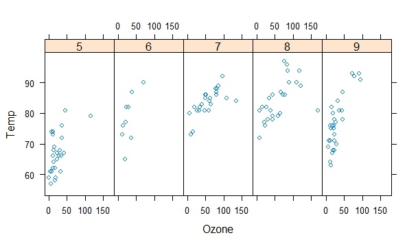 > xyplot(Temp~Ozone|Month,data=airquality,layout=c(5,1))