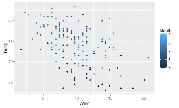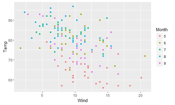 > qplot(Wind,Temp,data=airquality,color=Month) #将月份设置为分类数据