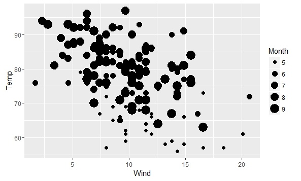 > qplot(Wind,Temp,data=airquality,size=Month)
